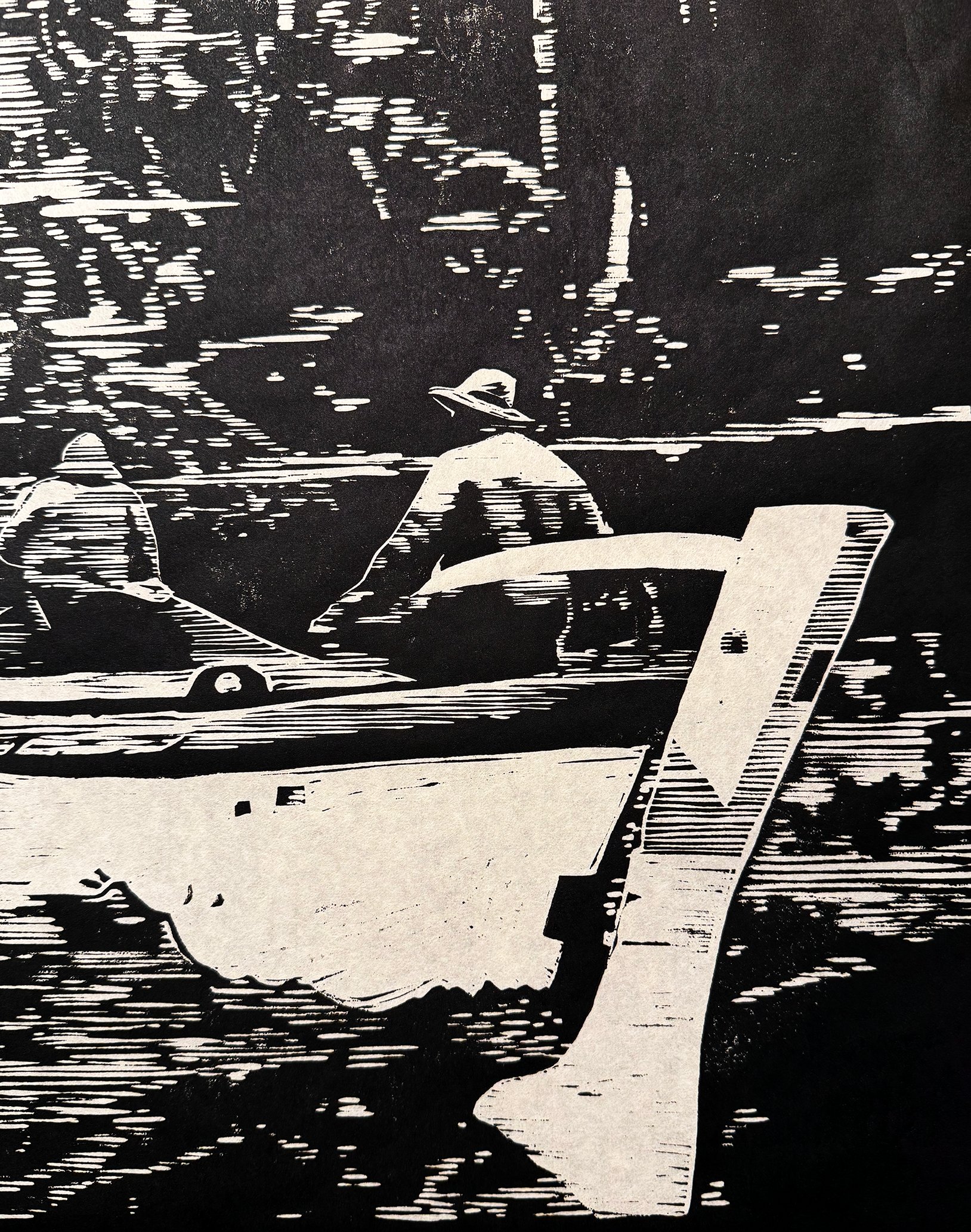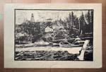 Linocut print on paper depicting the workboat resupply of Pachena Point Lightstation on Vancouver Island, BC.